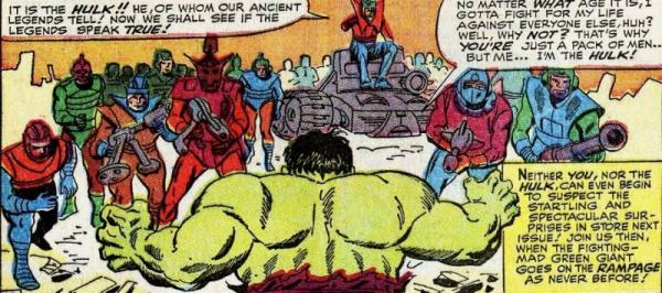 Злой инопланетный учёный по имени Йендрот (Yandroth), который уже несколько раз противостоял Доктору Стрэнджу, создал машину под названием Омегатрон (Omegatron), чтобы уничтожить Землю и обрести невероятное могущество. Для победы над ним понадобились совместные усилия Стрэнджа, Халка, Нэмора и Серебряного Сёрфера. Так появилась команда Защитники (Defenders). После этого приключения Халк ответил на вызов Мстителей, и вместе они не позволили Аресу (Ares) и Чаровнице исполнить древнее пророчество и получить власть над миром. Позднее Зелёный Гигант попал в Египет, где его уговорили принять участие в съёмках фильма. Впрочем, скоро продюссеры пожалели о своём решении и уволили Халка, который попал в эпицентр битвы пришельцев Хорузиан (Horusians) и уничтожил их лучшего бойца — Колосса (Colossus. Этот Колосс не имеет отношения к Петру Распутину — примечание переводчика).