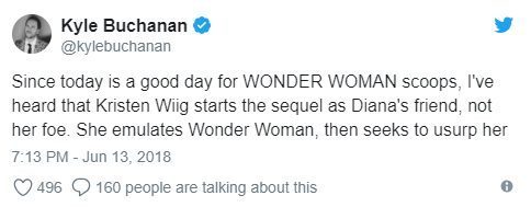 Поскольку сегодня – отличный день для сенсаций по «Чудо-Женщине», расскажу. Я слышал, что Кристен Уиг появляется в фильме сначала как подруга Дианы, а не как враг. Она соперничает с Чудо-Женщиной, а потом пытается потеснить.